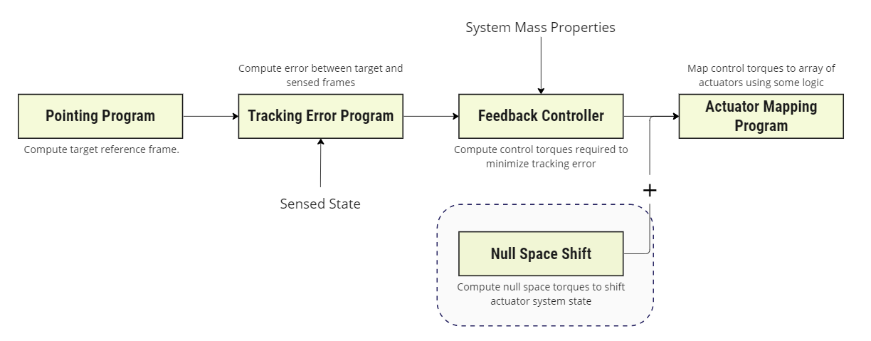 - Drive Steady State RW Speed to Non-Zero Condition: Reaction wheels typically operate poorly near zero RPM. Use of a null space to drive reaction wheel speeds away from zero steady-state spin can improve pointing performance.