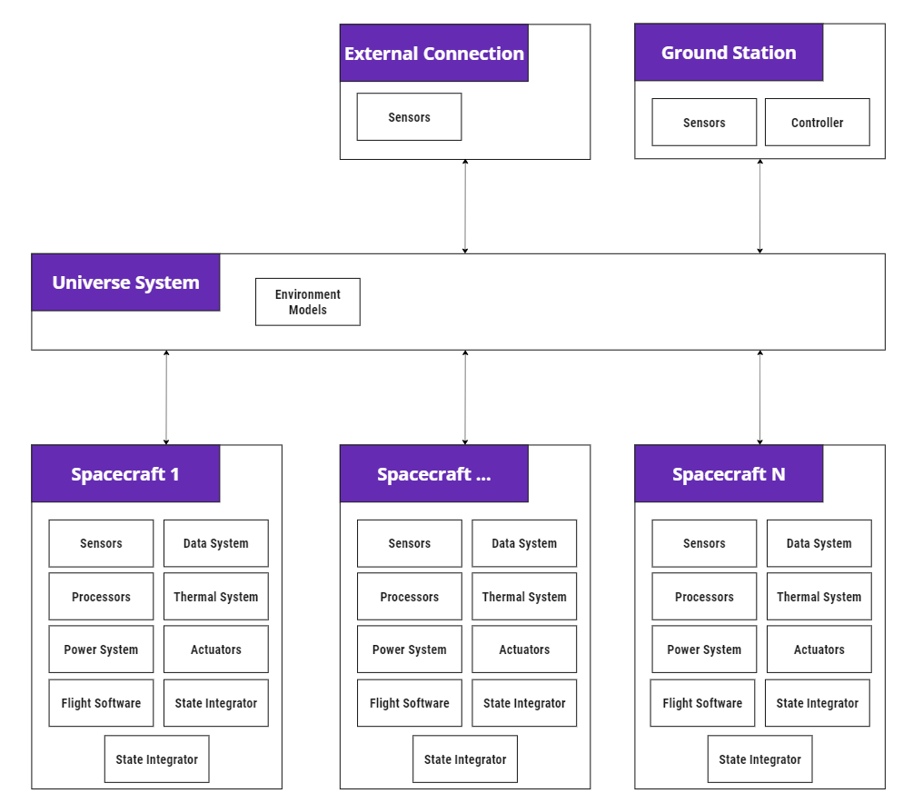 The spacecraft module is a special implementation of the core DynamicBody class, which is an abstract class that handles the modular integration of 6 degrees of freedom (6dof) equations of motion using a back substitution method. The spacecraft module is designed to act as a container and manager for Components, which includes both physical and virtual (software) components. When created, it will automatically search for and connect to an available Universe system, which provides the default communications bus between the spacecraft and other modules as illustrated in the diagram below.