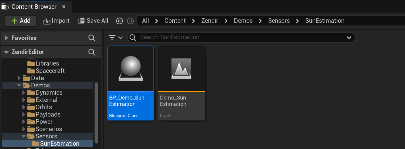 Within the folder, each demo shows off a particular set of features in the simulation program. The default one that opens when Unreal is launched is the Demo_SunEstimation example. Some key demos of interest are: