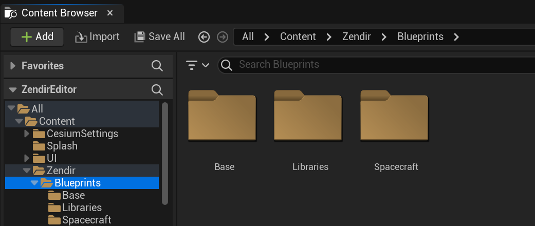 The Blueprints folder contains all of the example Spacecraft, Ground Stations and other objects used within the demos. These are typical objects that should be used when constructing new levels for the first time as they have already been assembled and include the appropriate parts.