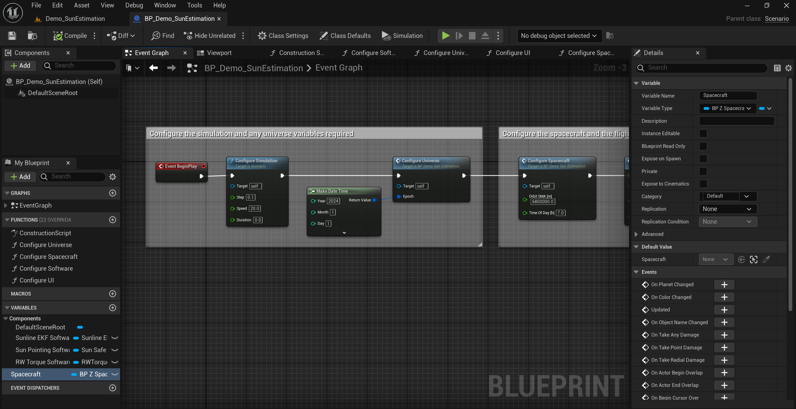 Once the demo blueprint is opened, the code within the demo will be available. The Event Graph is the standard code space for when the components are run in the simulation. A standard-level blueprint graph will look something like the following:
