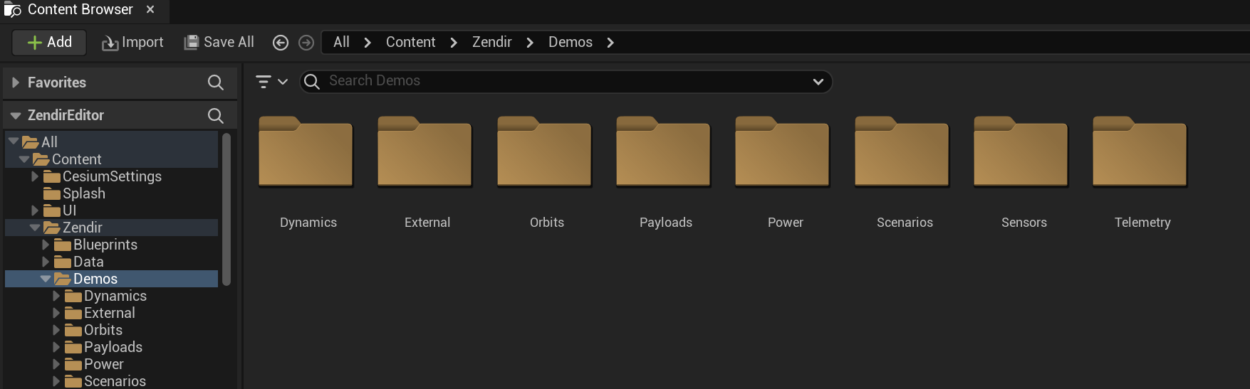 Within the Content/Zendir/Demos directory in the Content Browser, many demos showing off the capability of Zendir Editor and the simulation platform are shown. These demos can be opened and edited. Demos are filtered by category, with each category containing several demo levels.