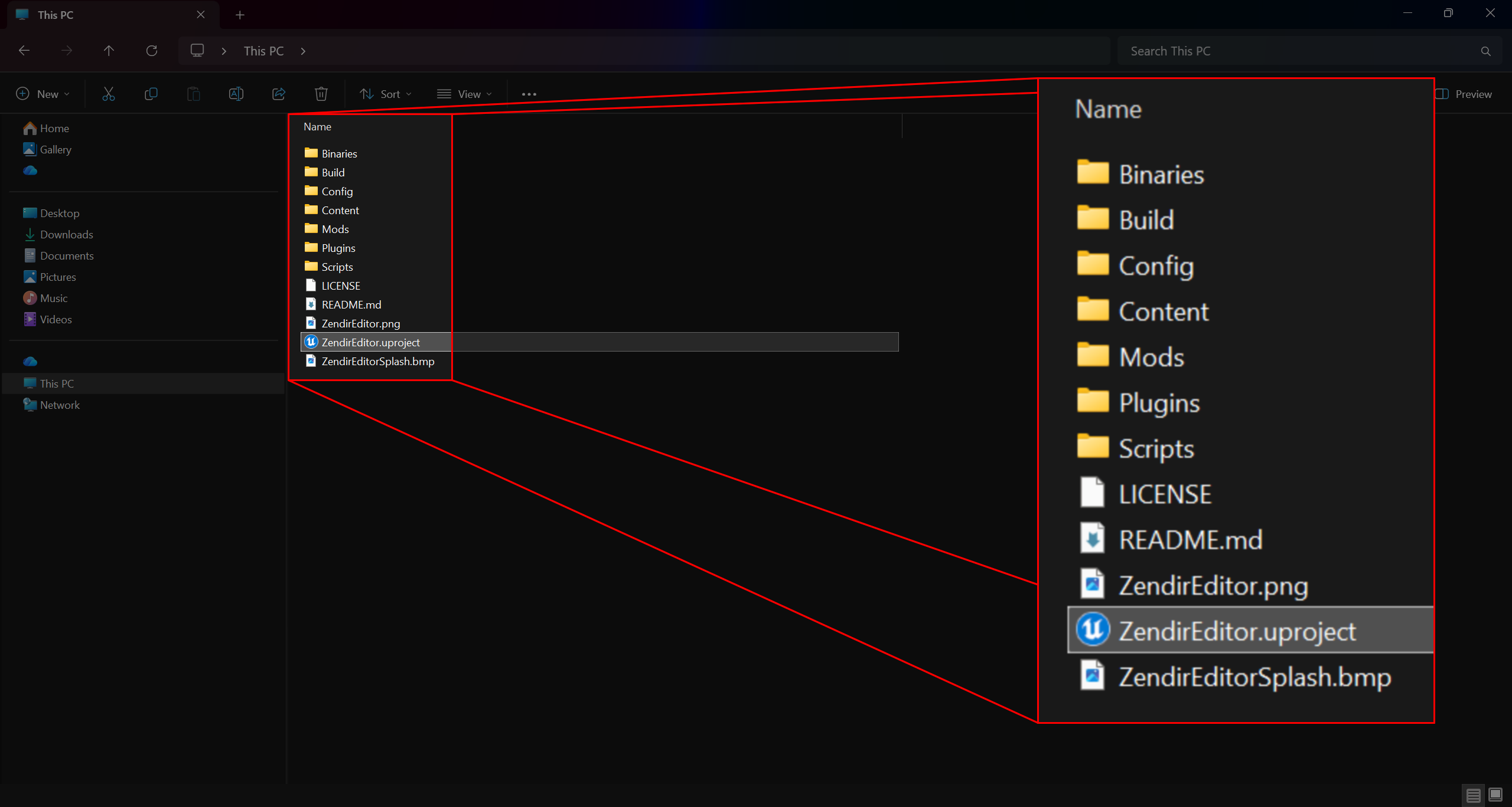 Extract the downloaded .zip file to your preferred location, right click ZendirEditor.uproject, Open With and select Unreal Engine: