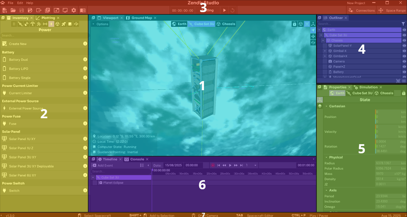 1. The Viewport: The 3D visualization of the simulation is displayed here. There are options for enabling different view modes which is important for appending your spacecraft’s hardware. More information can be found on the Viewport Panel page.