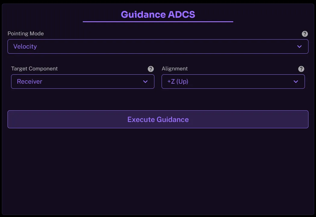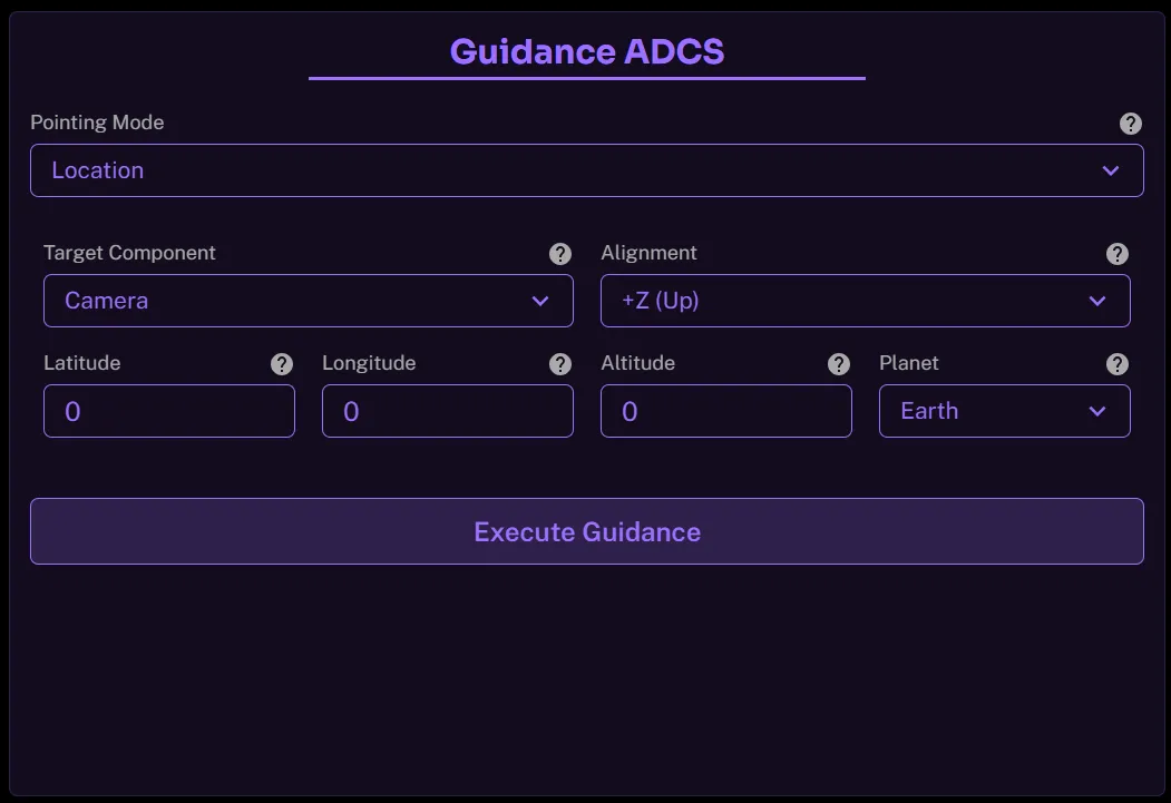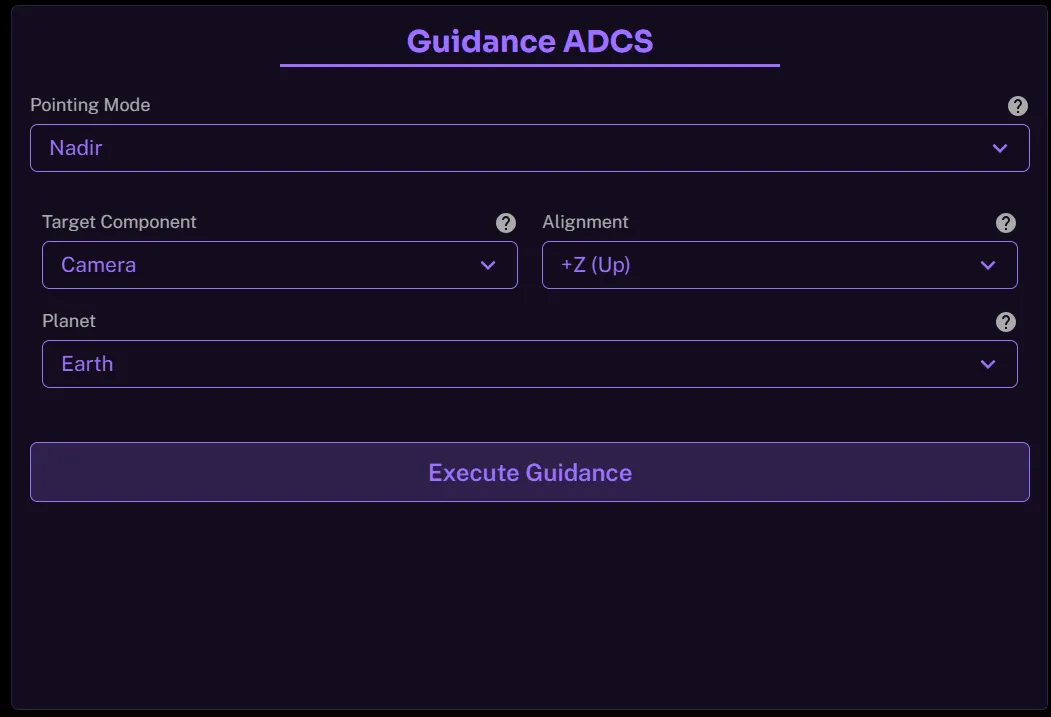 The spacecraft maintains its +Z axis (or payload axis) pointed toward the Planet’s geocentre (local nadir direction). This keeps instruments directed vertically downward toward the Planet’s surface as the satellite orbits. Nadir pointing is the standard mode for Planet-observing spacecraft, weather satellites, and communications payloads that require Planet-facing antennas. The user has the ability to choose from a list of celestial bodies for this pointing mode.