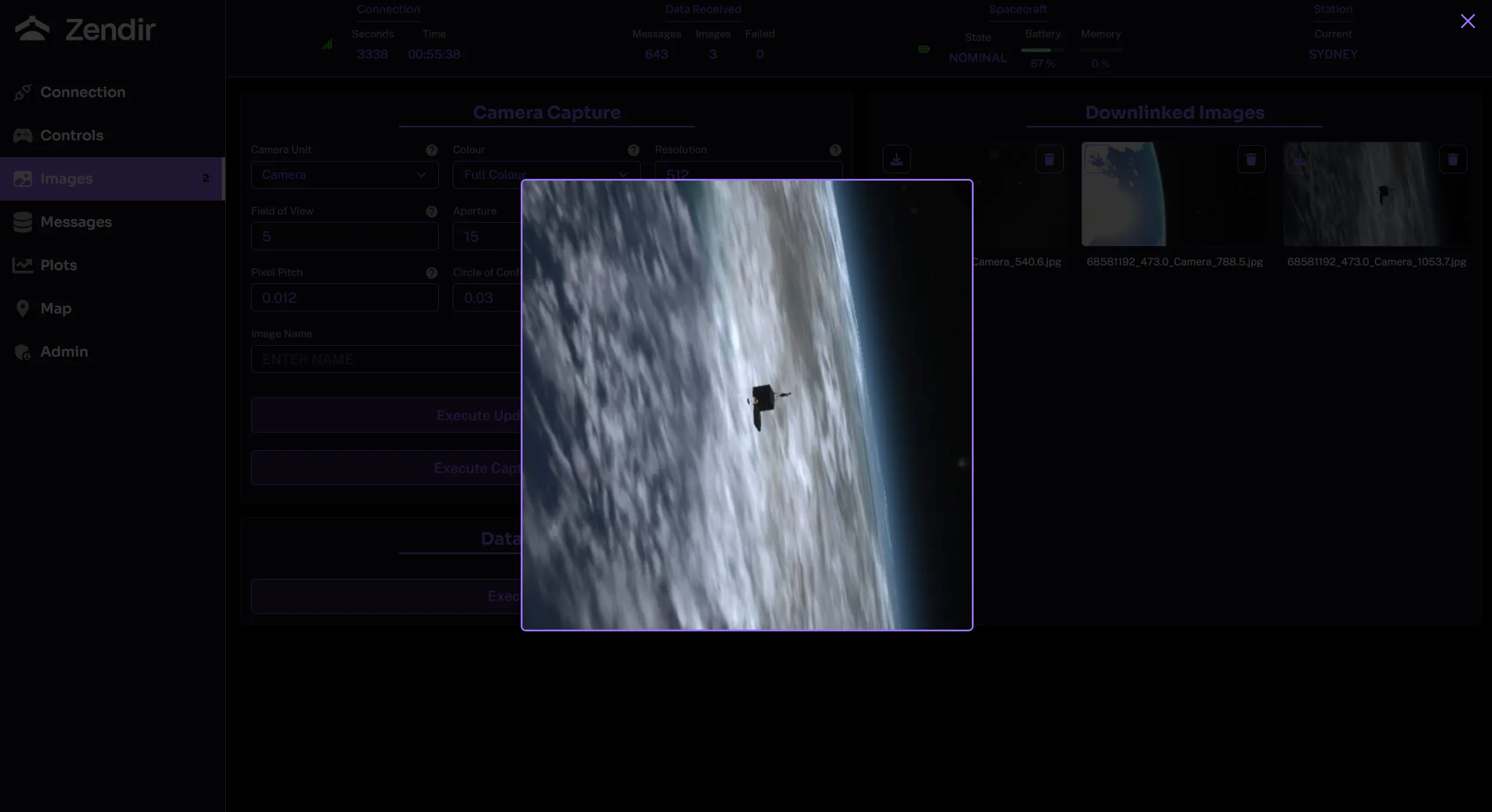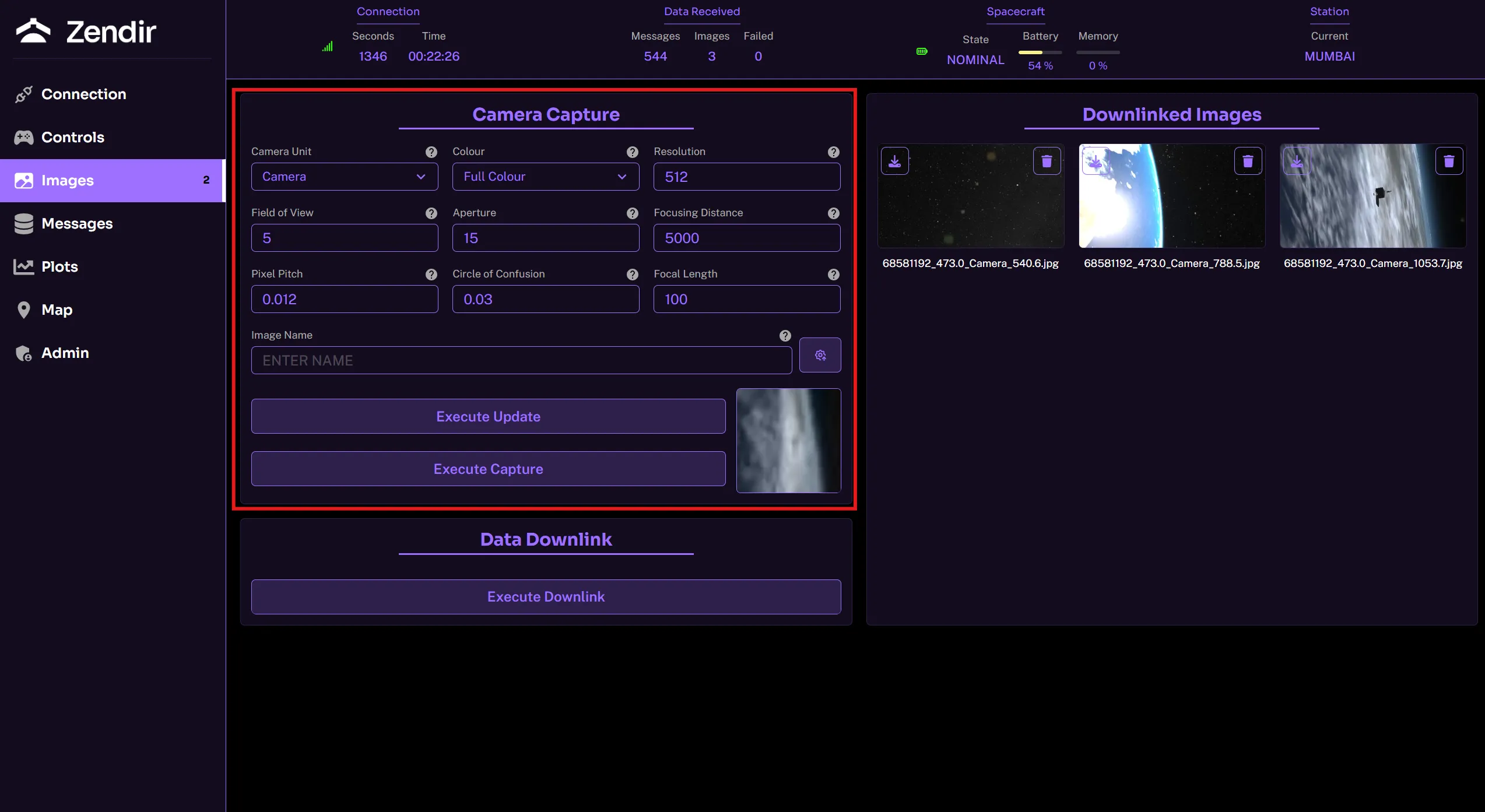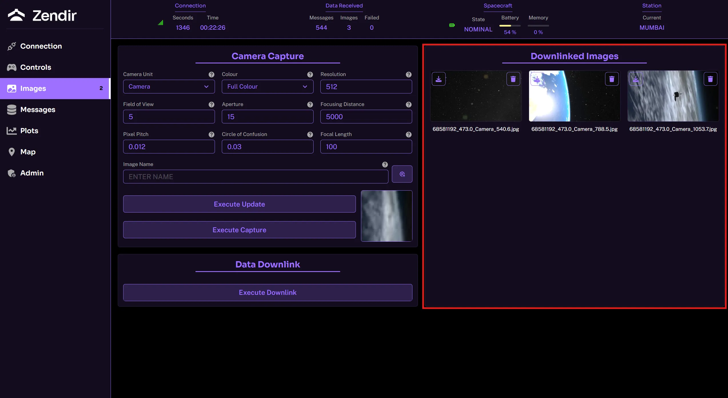 Captured images, once downlinked, appears on the downlinked images section. These are unique to the scenario and if the scenario is restarted, these images will be removed from the gallery.
