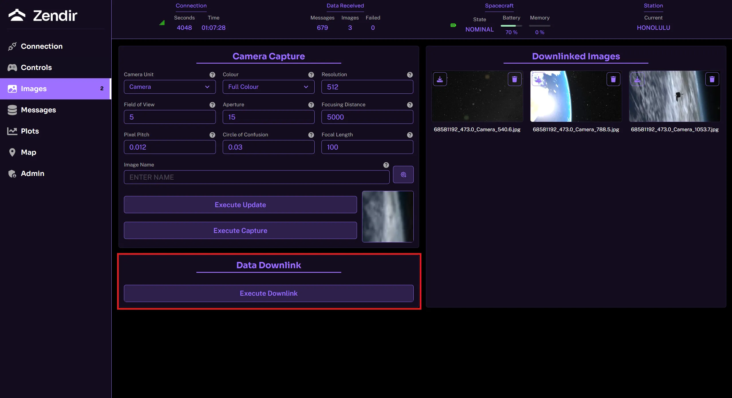 The Execute Downlink button enables the spacecraft to downlink all of its data stored in its buffer from sensor readings to images captured.