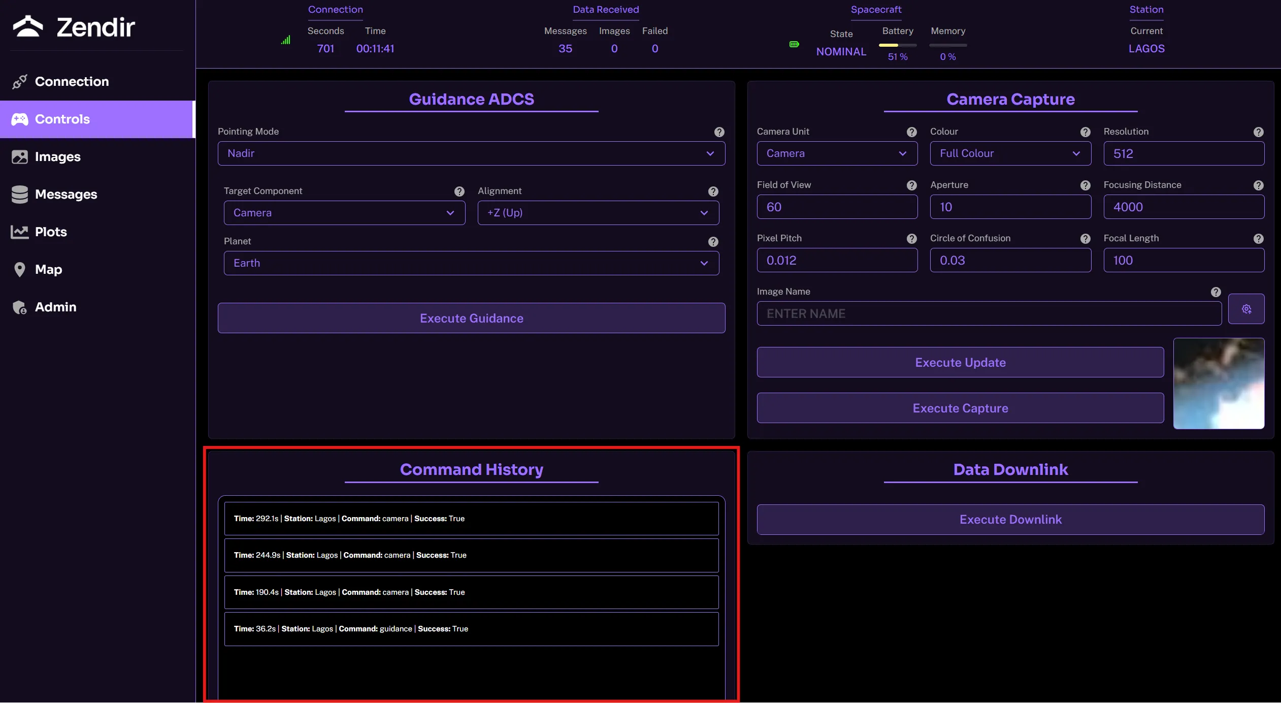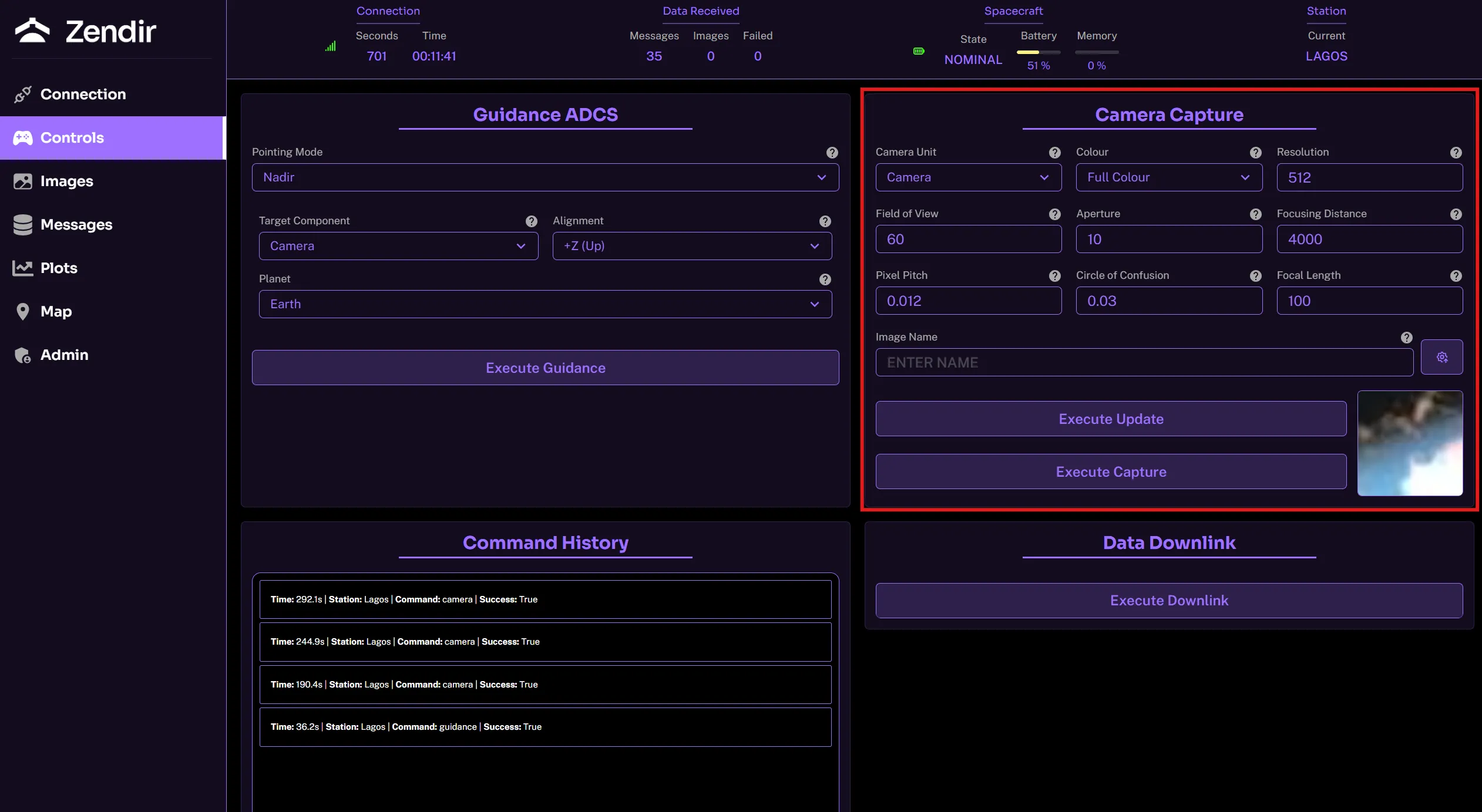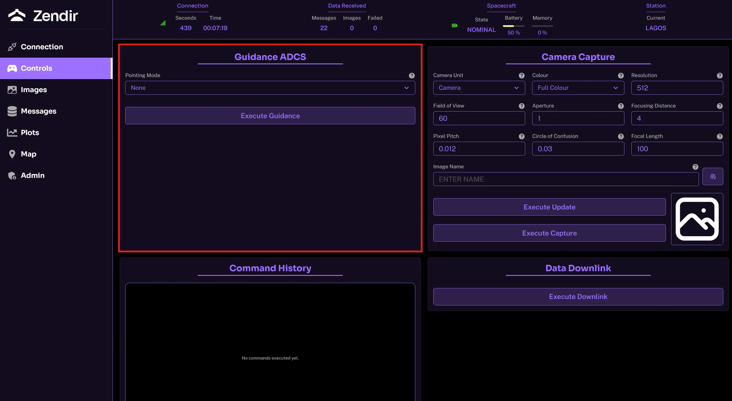 The Execute Downlink button enables the spacecraft to downlink all of its data stored in its buffer from sensor readings to images captured. By default, only ping information is sent back to the operator terminal from the spacecraft. All other sensor data is stored on the spacecraft until a downlink is called.