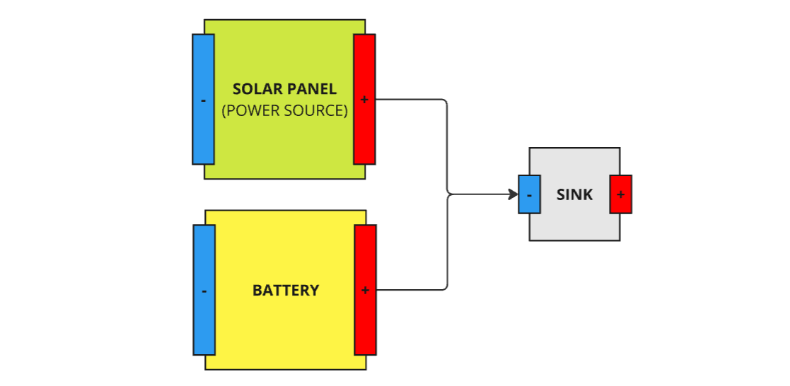 - Battery Charging: Connects a battery to a Solar Panel for simple battery charging from a power source.