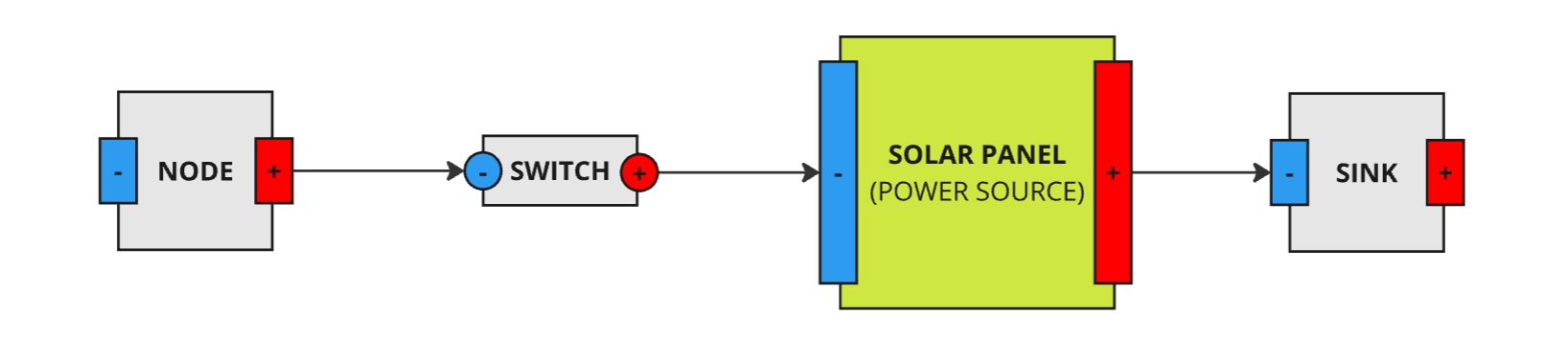 The following circuit shows a solar panel connected with a switch, a node and a sink. If the switch is open, then the network will not have a current. Otherwise, the solar panel can power the node and dissipate the rest of the power over the sink.