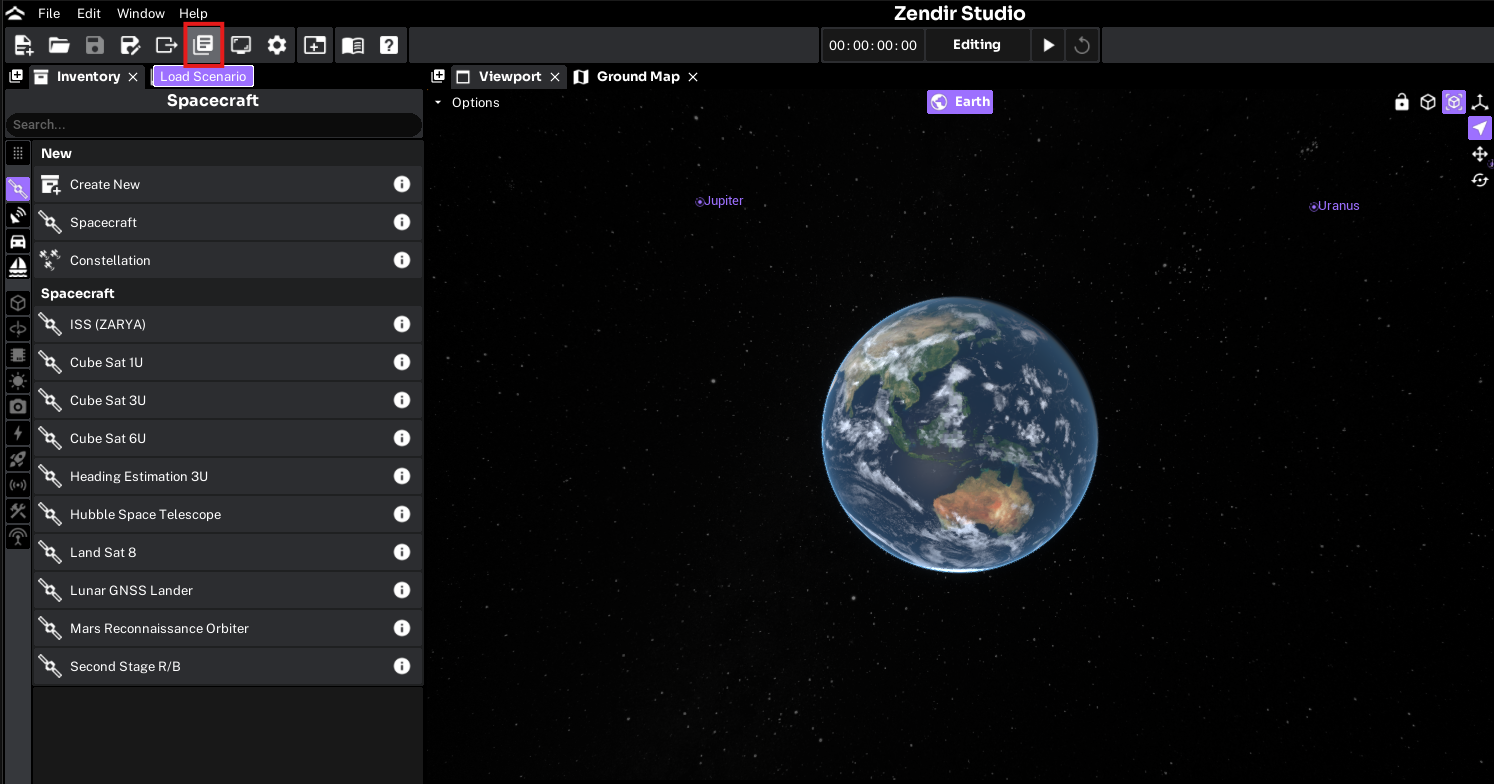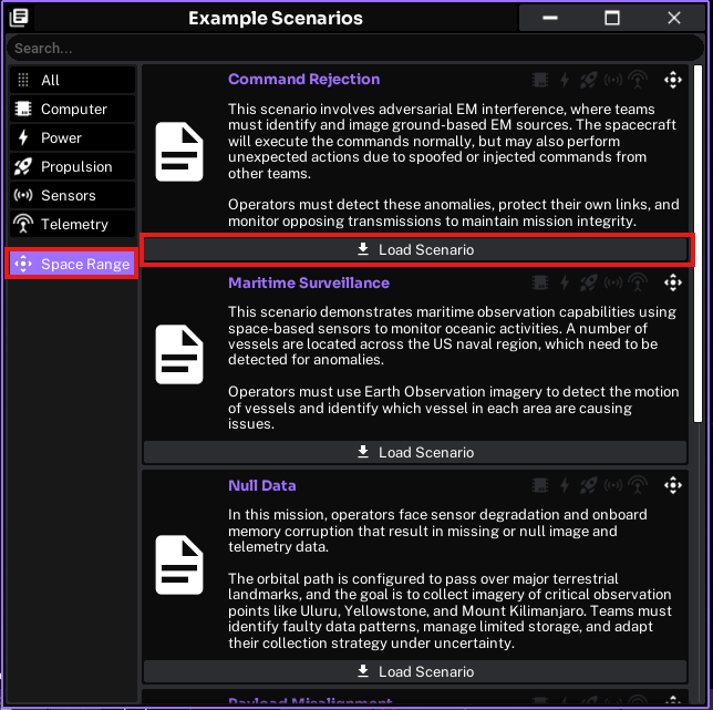 First load up a Space Range scenario by selecting the Load Scenario button at the top left corner. This will list all of the available scenarios in Studio. Select the Space Range category on the left side and it will show only the Space Range scenarios. Select one to load, this guide will use the Command Rejection scenario.