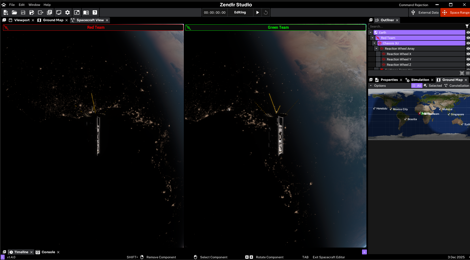 Upon loading a scenario you will see the visualization of the scenario. Each scenario will have a different visualization but most will have 2 spacecrafts representing the two teams.