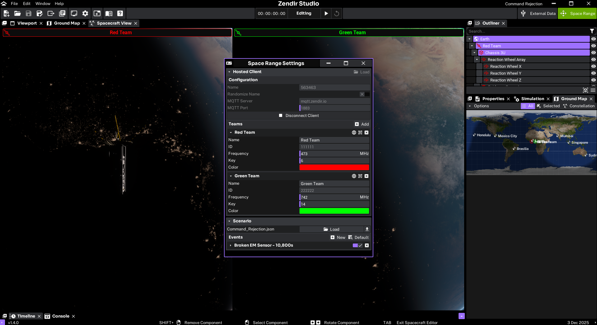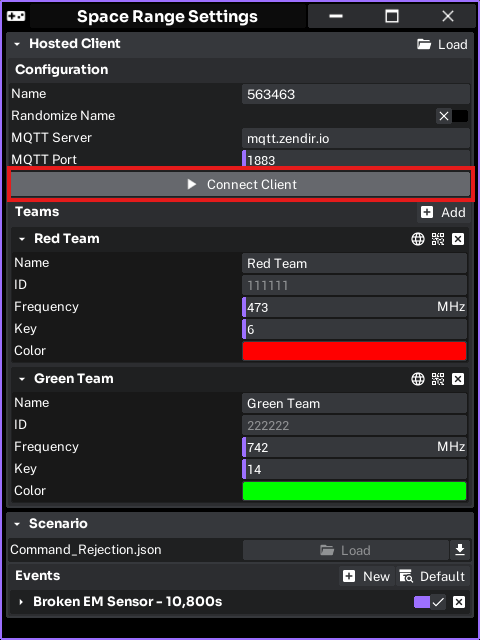 The Space Range Settings should already have a preset for the scenario loaded. To start the server, click the Connect Client button and it will create a server that users will be able to connect to the session using the configuration and team settings. See Connecting to a Server on how to connect to the session.