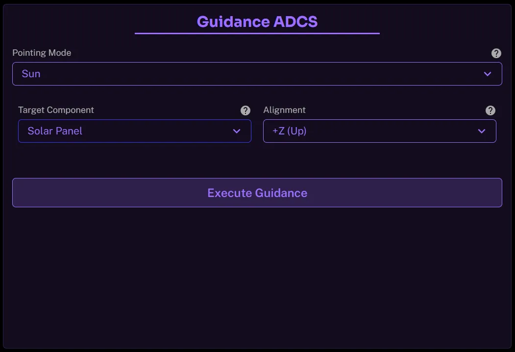 The spacecraft maintains its +Z axis (or payload axis) pointed toward the Planet’s geocentre (local nadir direction). This keeps instruments directed vertically downward toward the Planet’s surface as the satellite orbits. Nadir pointing is the standard mode for Planet-observing spacecraft, weather satellites, and communications payloads that require Planet-facing antennas. The user has the ability to choose from a list of celestial bodies for this pointing mode.